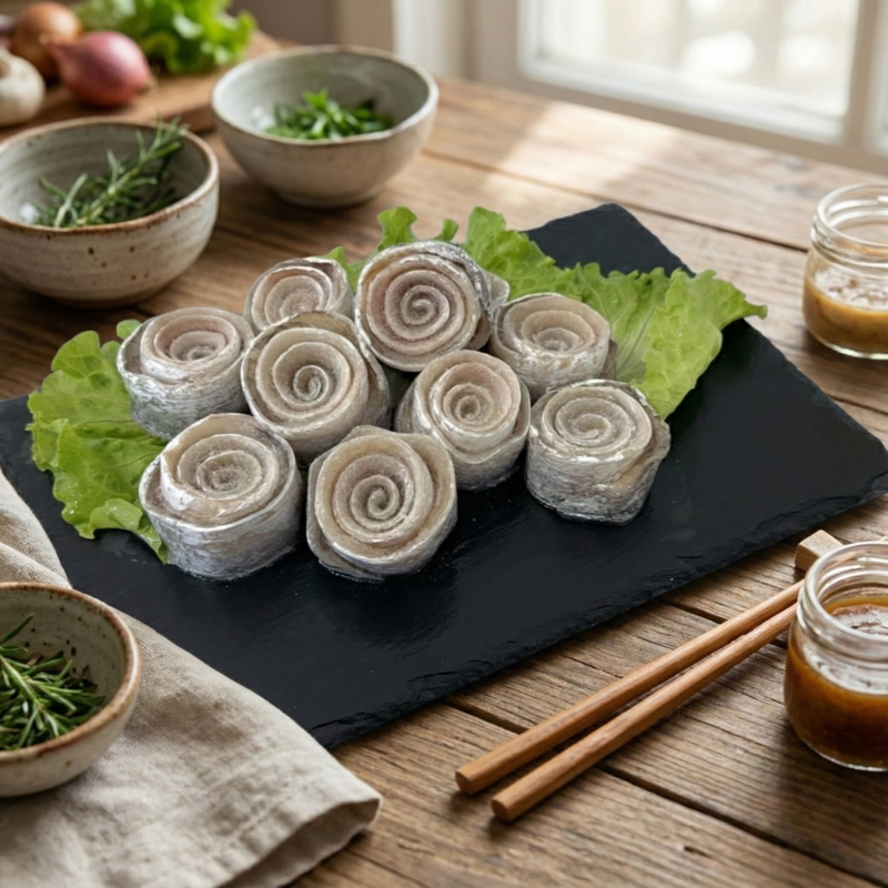 經專業人工去骨去刺後,手工捲製成精美的花朵狀